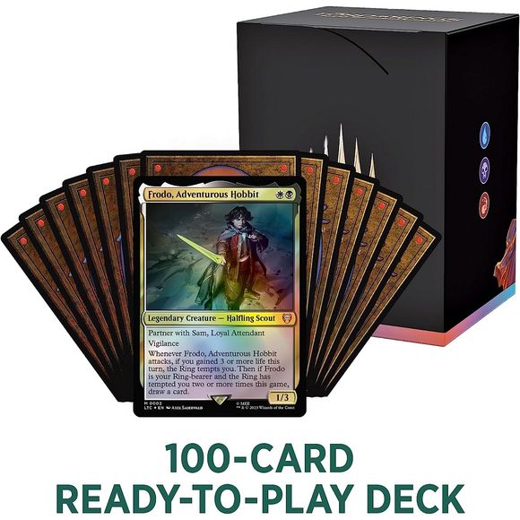 The beloved story and characters of The Lord of the Rings meet the thrilling gameplay of Magic: The Gathering in this The Lord of the Rings-themed Commander Deck. Try out Magic’s most popular format with a deck that’s ready to play right out of the box and fight for the fate of Middle-earth. The Lord of the Rings: Tales of Middle-earth Food and Fellowship Commander Deck set includes 1 ready-to-play White-Black-Green deck of 100 Magic cards (2 Traditional Foil Legendary Creature cards, 98 nonfoil cards), a 2-card Collector Booster Sample Pack (contains 1 Traditional Foil or nonfoil special treatment card of rarity Rare or higher and 1 Traditional Foil special treatment Common or Uncommon card), 1 foil-etched Display Commander (a thick cardstock copy of the commander card with foil etched into the card’s border and art), 10 double-sided tokens, 1 Helper card, 1 deck box (can hold 100 sleeved cards), 1 Life Wheel, 1 strategy insert, and 1 reference card.